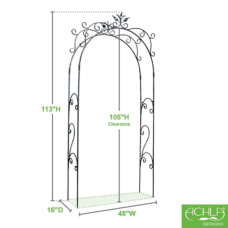 Elevate your outdoor space with the Tuileries Arbor by Achla Designs. Drawing inspiration from the iconic Tuileries Garden in Paris, this handmade wrought-iron arbor boasts a classic European scroll design and a striking finial with three upward-pointed leaves. Standing at 9’4” tall, 4’ wide, and 15” deep, it offers ample room for passage and is perfect for framing a walkway or seating area. And with its easy assembly and sturdy design, it’s the perfect support for climbing plants – no tools necessary!