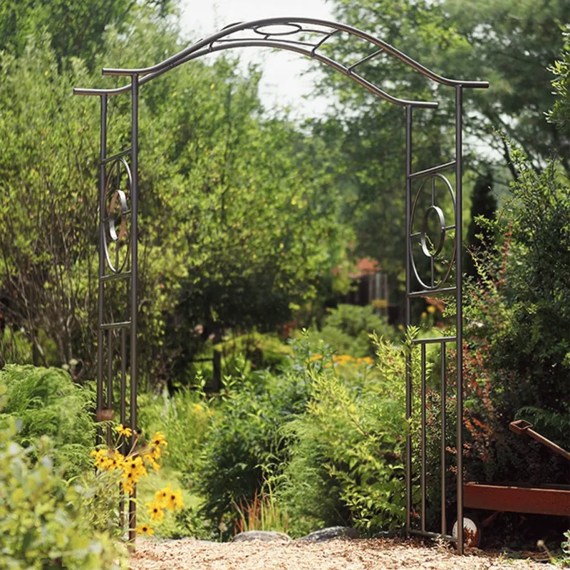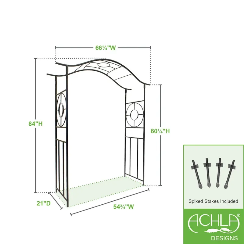 Fashion a regal garden entrance with the handcrafted wrought-iron Tuscany Arbor by Achla Designs. Adorn your garden with its graceful arches and striking circular motif, and add charming climbing vines with plenty of room for passing beneath. This smaller, compact arbor ships flat and requires no tools for assembly; four spiked stakes are included to place it in the ground.